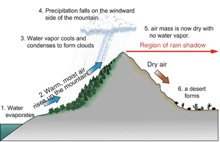 El aumento de la humedad se condensa en nubes de lluvia, que provocan lluvia en el lado de barlovento de la montaña. Por muy poca humedad que llegue al lado de sotavento y a la atmósfera de la ciudad, no es suficiente para formar nubes de lluvia. Se evapora por el aire hambriento, seco y caliente que se cierne sobre la ciudad.